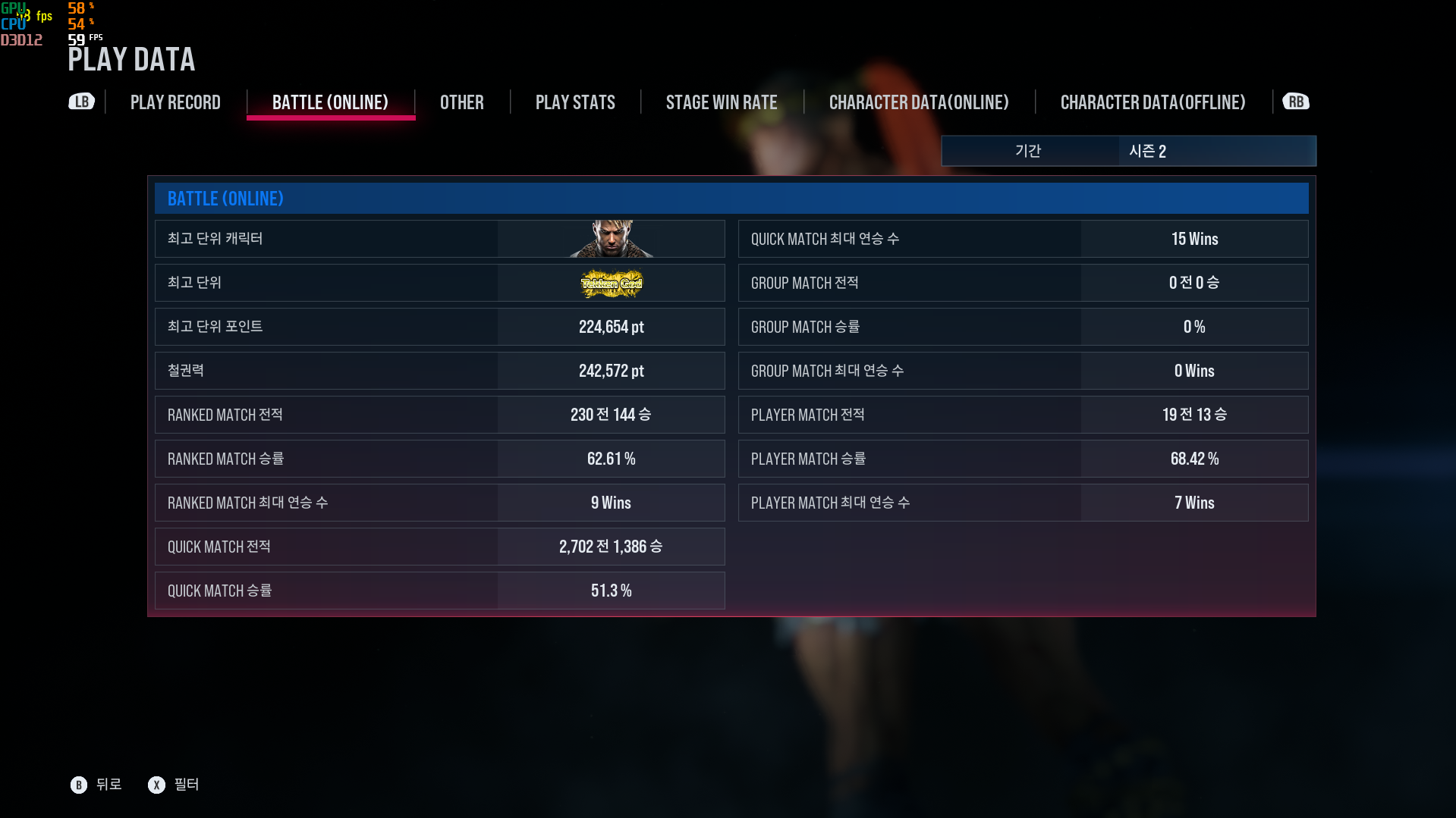 최고 단위 포인트는 224,654 pt, 최고 철권력은 242,572 pt로 마무리했습니다.