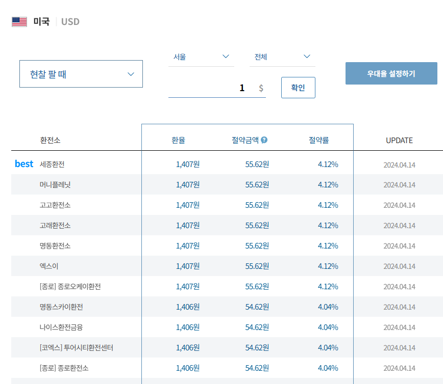2024년4월12일 금요일 1380원으로 마감했는데 2024년 4월14일 일요일 명동 사설 환전소에서는 1달러에 1407원으로 매입한다는 곳이 꽤 생겼네요 인베스팅 닷컴에서 2024년4월13일 오전12시에 닫은 마지막 환율 1380.6원 보통 기준환율로 거의 매입하던데 이정도의 스프레드를 높여서 매입하는것 이례적이네요 전세계적으로 달러 강세에 대한 영향이 한국에도 바로 나타나는것 같네요. 명동 환전소는 무슨 정보가 있나.. 일반적으로 명동 환전소라고 하는데 이유는 외국인들의 관광장소중에 TOP1 이라서 외화의 유동성이 엄청나게 높은곳이라서 상당수의 사설환전소가 명동에 모여있어요.